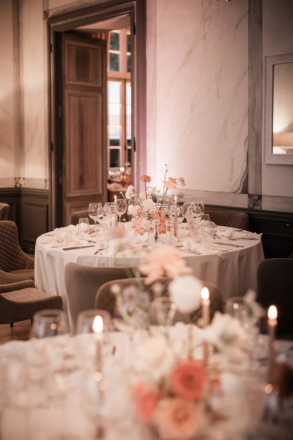 Les compositions florales, véritables signatures de cette décoration, mêlaient des roses poudrées et de délicates fleurs blanches. Des bouquets ornaient les tables, tandis que des arrangements plus structurés marquaient les espaces clés de la cérémonie. Cette palette douce créait un contraste subtil avec la modernité du lieu, offrant une atmosphère à la fois contemporaine et profondément poétique.